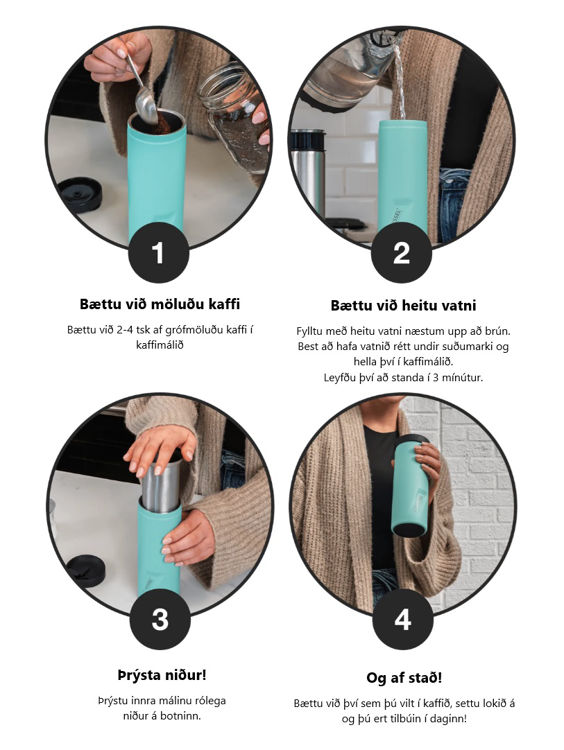 TriMax® þreföld einangrunPremium 18/8 ryðfrítt stálDrykkir snerta aldrei plast!Heldur heitu í allt að 6 tíma.414ml